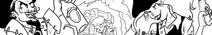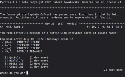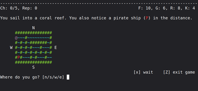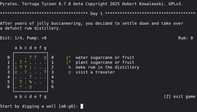 Pyrates is a suite of pirate-themed TUI computer games. The titular Pyrates is an exploration game peppered with logical puzzles. The Tavern is a managerial, in which the player runs a tavern on an exotic island. Adrift is a survival game, in which the player tries to survive on a tiny raft in the middle of the ocean and convert the raft into a boat. Tortuga Tycoon is a simple farming game about running a plantation for a rum distillery. The cover image by Jolanta Rebejko. #adventure #survival #puzzle #retro #textadventure #roguelike #pirates #managerial