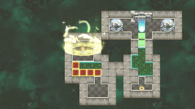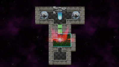 Turn all the panels to red to unlock the security gate, and step into the blue portal to charge the generator.