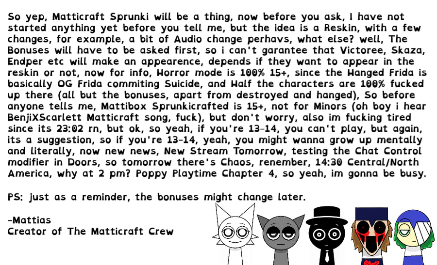 Its an Sprunki Retake Reskin mod with Matticraft's Oc's, Different Sounds (if possible) and Changes on the characters!