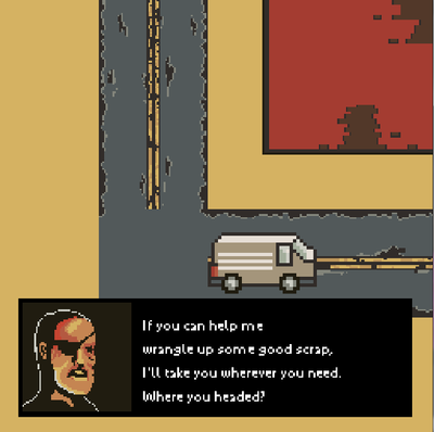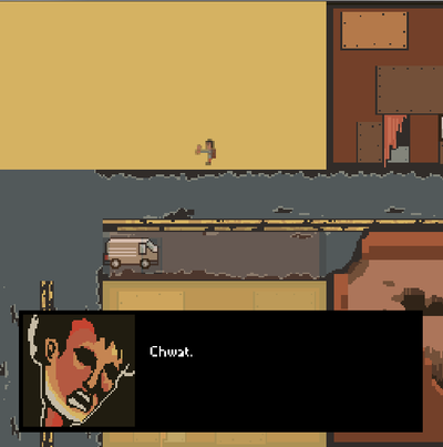 Play as a man hitchhiking through a broken city in order to reach a place called Chwat. made for the #badboxart jam.