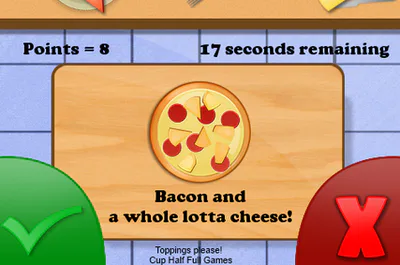 Toppings please requires you to use you quick wit to decide whether the chef has made the right order for the customer. This is achieved through comparing the description to the pizza itself.