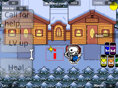 lv 1 - Sans, lv 2 - Toriel, lv 3 - Undyne, lv 4+50 coins - Mettaton, lv 5+beat ??? - Gaster, lv 6+100 coins - Jevil, lv 8 - some characers power up, 320 coins - lv up, 50 coins - heal souls, 100 coins - call Swap Papyrus for help.