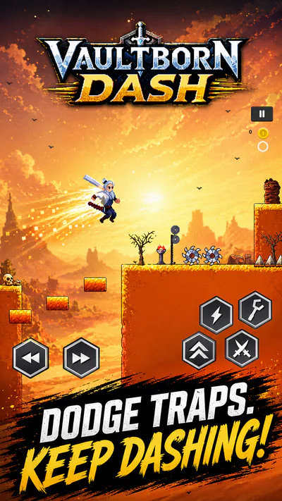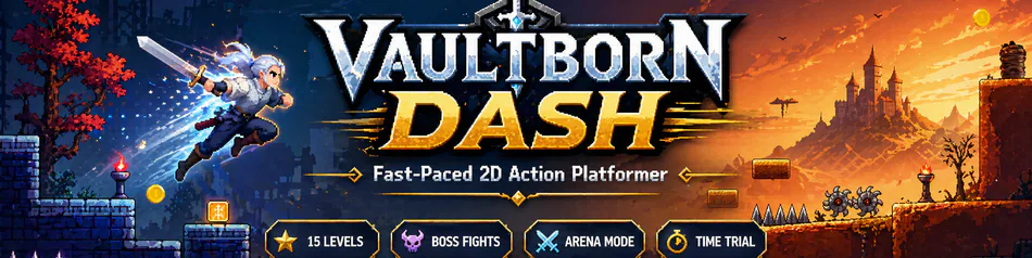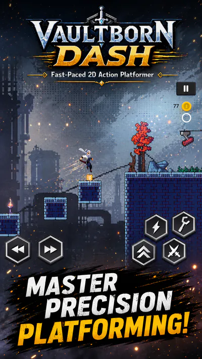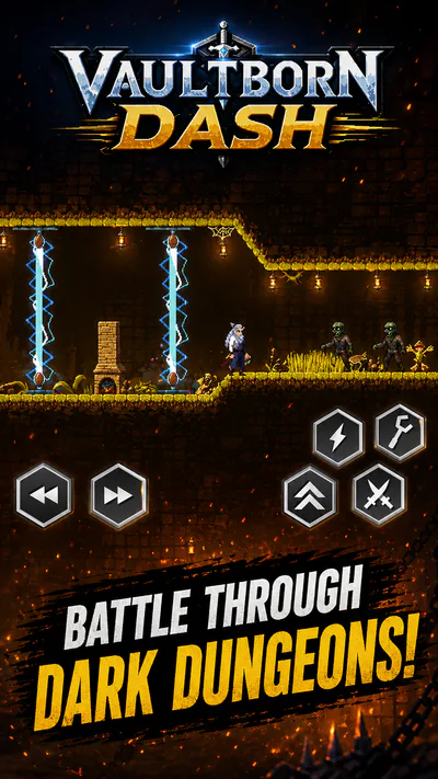 Vaultborn Dash is a fast-paced 2D action platformer for Android, focused on quick movement, traps, coins, enemies, and dungeon-style levels.