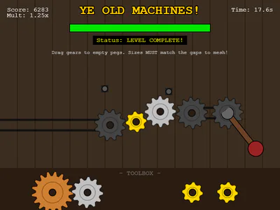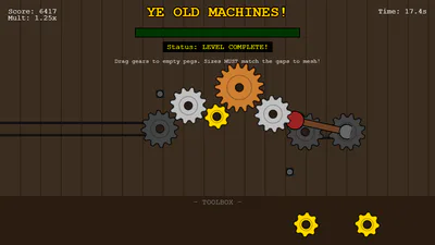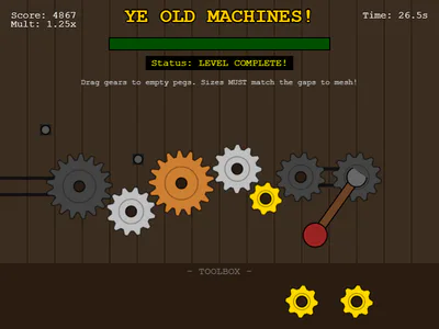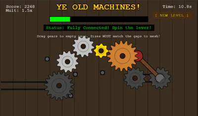 Fill in the missing gears and spin the lever. Mouse or Touch.