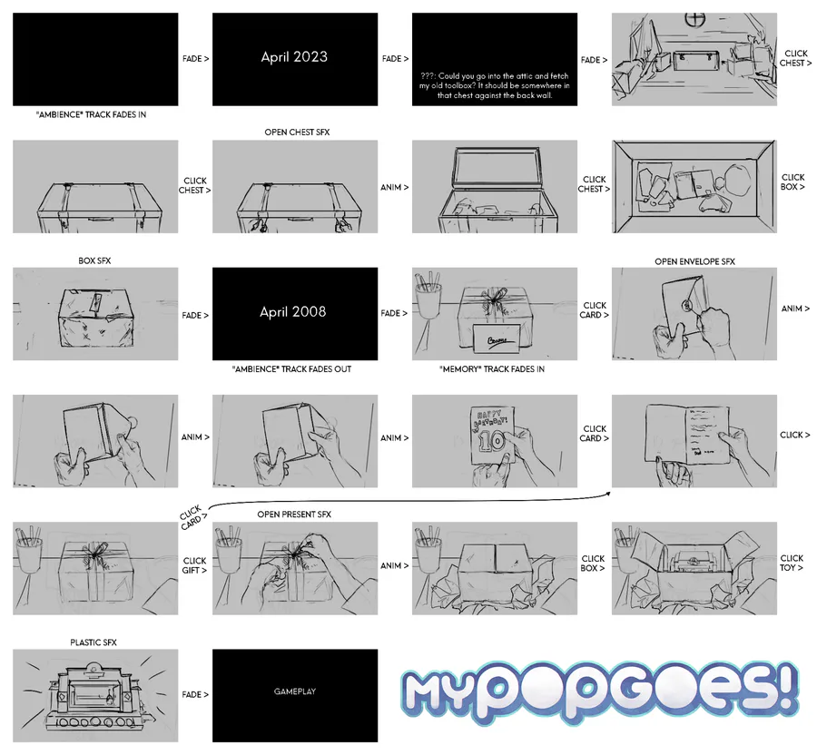 Here's a look at the original storyboard for the intro "cutscene" for myPOPGOES. It was only about a WEEK later that the trailer was released with finished artwork. (2023)