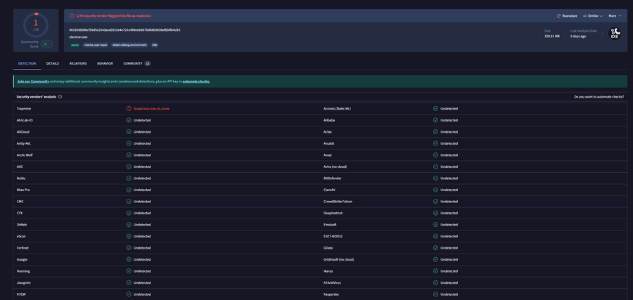 Idk why but virustotal flagged this game I am gonna investigate for a bit