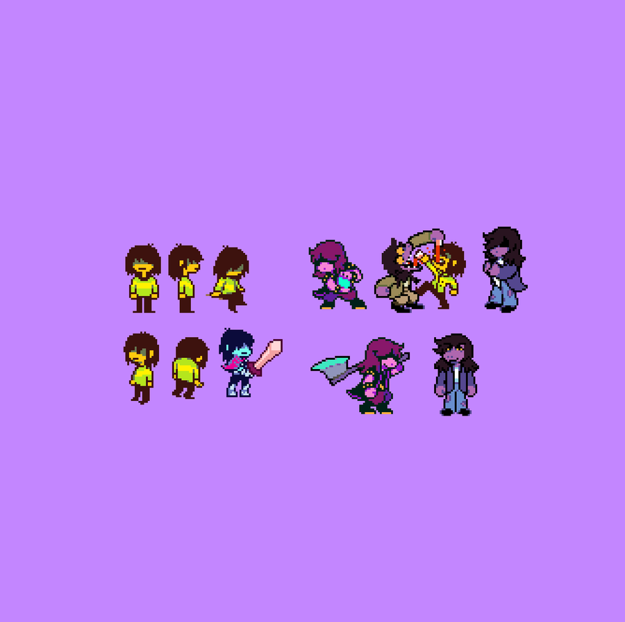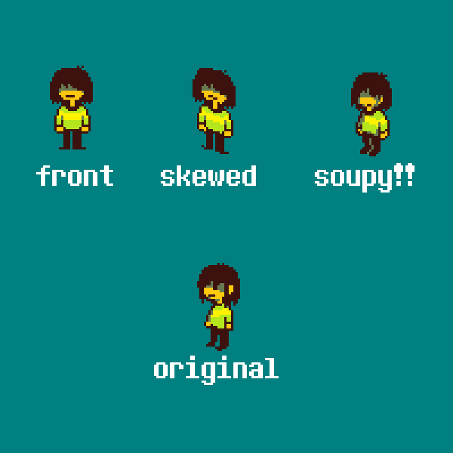 Whenever I see people attempting to make Deltarune battle sprites, they usually don't get the perspective right and just make their front-facing sprites look sideways. Not great. A technique I like to do is skew a front-facing sprite, then cleanup and edit from there! DR sprites for reference.