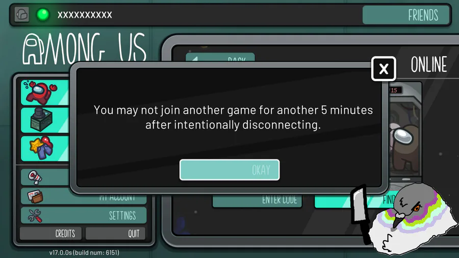 Got kicked from an amongus server by a hacker, now i can't play for 5 minutes.. Sigh..