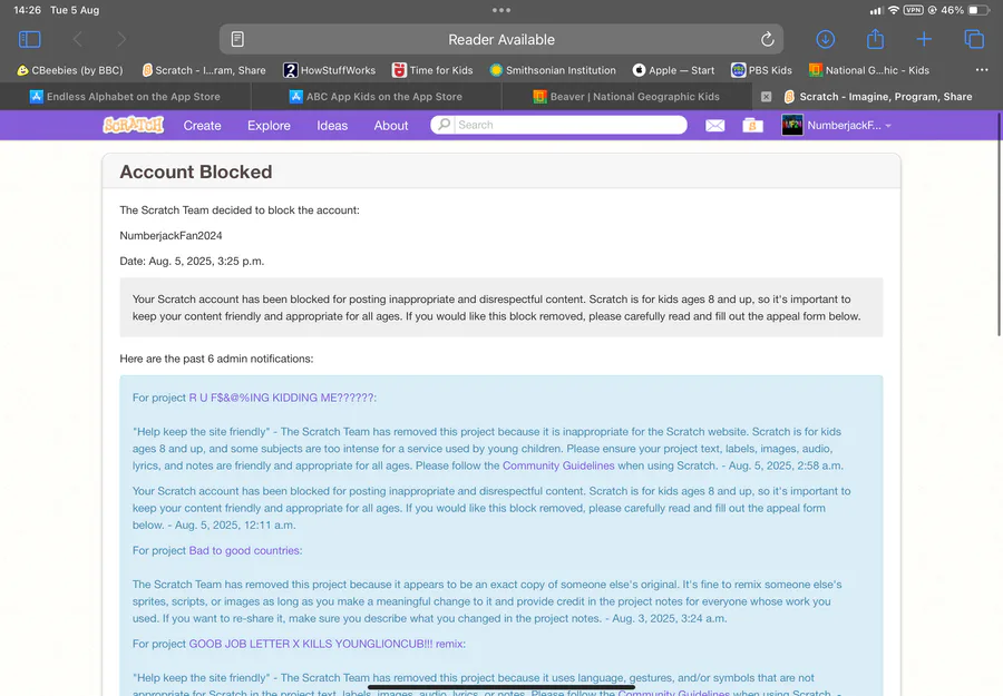 My Account is Blocked on Scratch on My tablet =[
