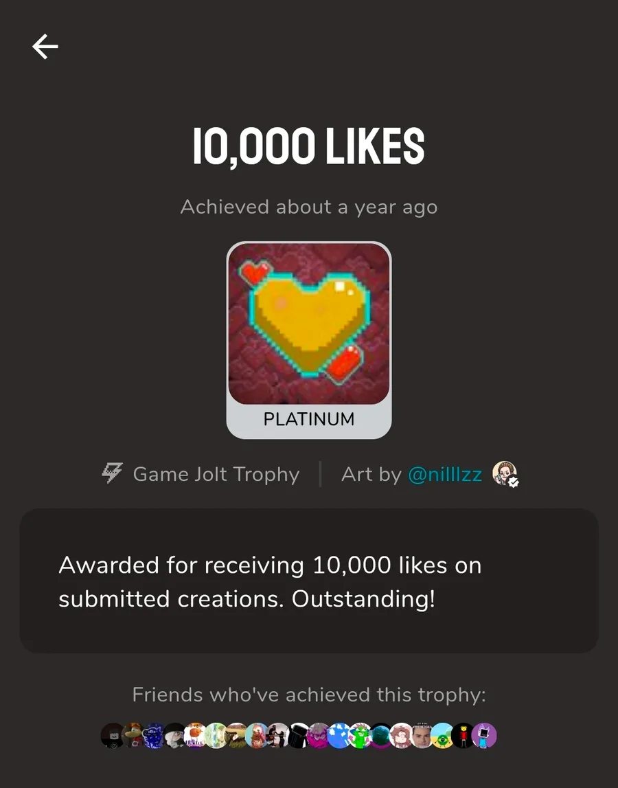 The 10,000 likes trophy is still bugged for years it seems, meaning you get this trophy even before you have 10,000 likes on your profile, and gamejolt still hasn't fixed that