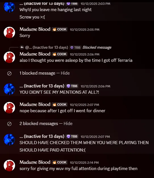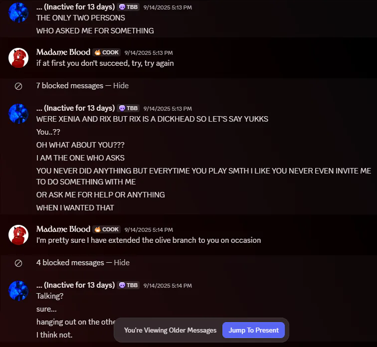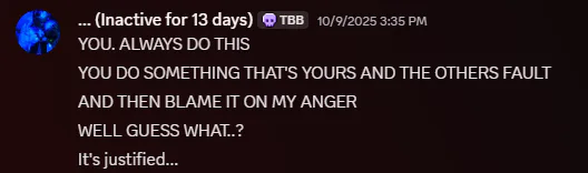 Another thing about her is that she can never recognize when she is wrong and always resorts to blaming things on me blaming the cause of the problem being her anger. Let alone the fact that she always expect a red carpet welcome whenever me or the others have planned sessions. The expectation was that she could pop in whenever she wants, and in all the cases when I've extended the olive branch to her she's denied it and then blamed me for feeling lonely.