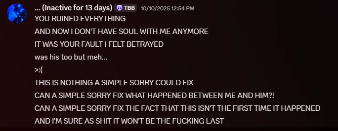 Let alone the fact she's easily Jealous and takes out her anger on me and never fails to make that known whenever me and somoene else are playing a game or doing anything to pass the time while waiting for her. Let alone the fact she has a tendency to blame others for other people leaving her because of the fact she's unpleasant to be around. Her unrestrained anger issues coupled with the fact she's not medicated for BPD is a recipe for how you make someone into a disaster and mess them up for life.