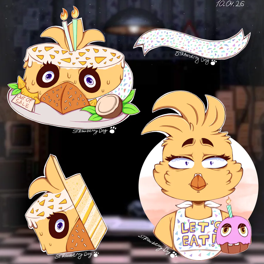 Good day! Third teaser for fnaf univ/fanv with cake designs for 'Unw Chica' with two types! Also shown are the filling inside the cake and the wrapper design. 14/???