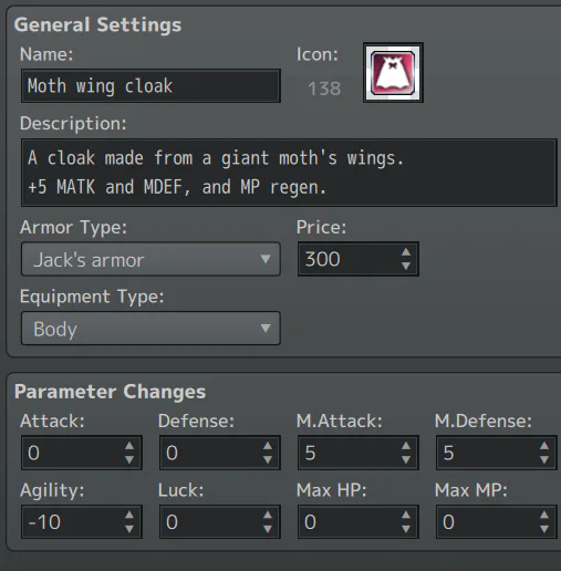 I've changed some stats of mainly secret armors and weapons to be slightly more interesting than '+x stat but -y stat', now theres stuff affecting mp/tp costs, passive regen and more.