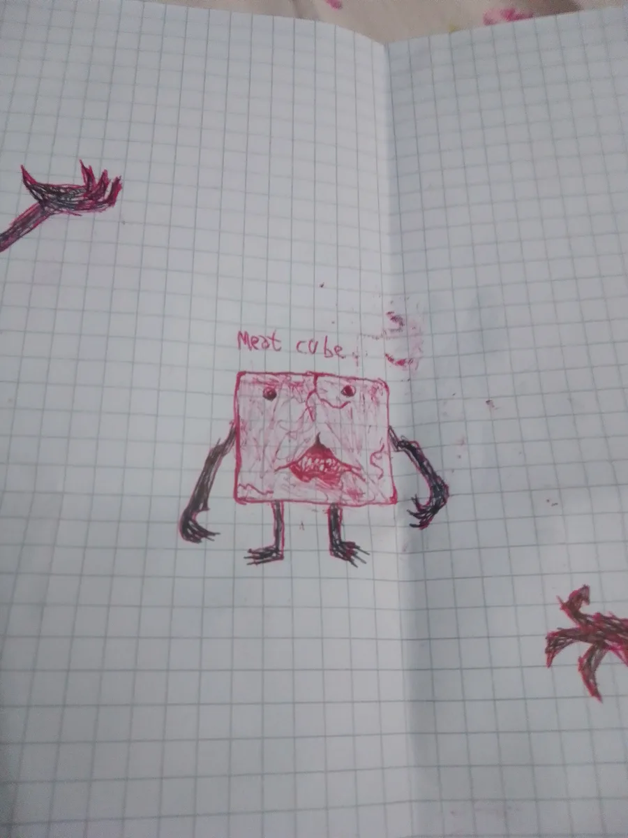 this is meat cube,my weird creation i made in school.when I was bored,feel free to make head-canons or fan art