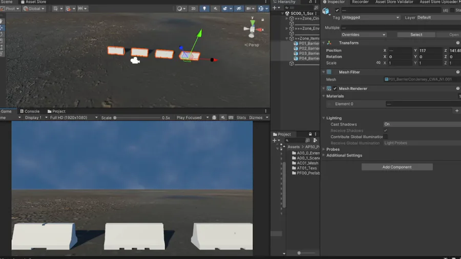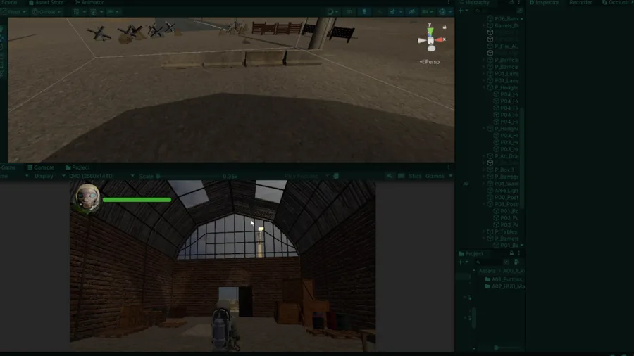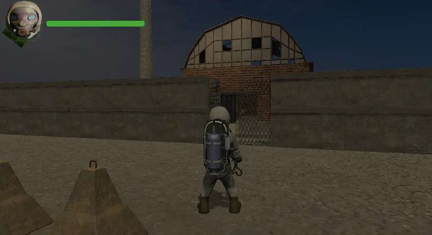 ScreenShots Scene of GamePlay OverallSuitMan - Barricades And Walls Concretes. #b3d, #blender, #unity, #game, #scene, #galpon, #barricades, #wallsConcrete, #levelDesign.