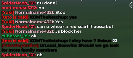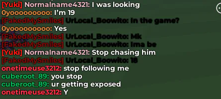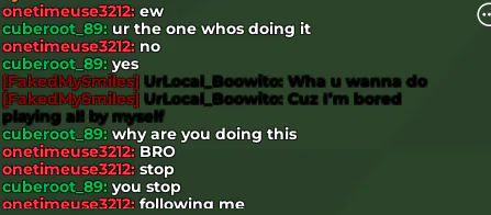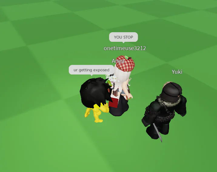 so when i was play cac peacefully, a user named onetimeuse3212 was following me, i found it as an joke as first, but it started getting uncomfortable, she started using twerk emotes even i was a 10 year old minor. it was GROSS. so I was roaming while her following me, so an guy named Yuki told her to stop, and then onetimeuse3212 was accusing me of following her even though shes the one whos following me, Yuki kept telling her to stop, so he she didnt listen and kept doing it... and I said I just dont like it...