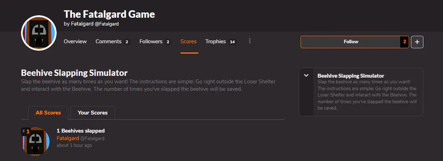 The Post Office is not yet done being polished, BUT I have set up a scoreboard for slapping the beehive, along with a couple of trophies. Obviously, these aren't obtainable until I release a demo.