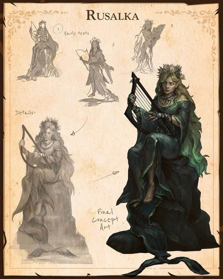 Her calm presence hides something ancient beneath the surface. From early sketches to final concept, her design reflects beauty, memory, and quiet danger.