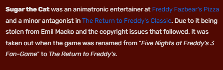 sugar is the cat reference to the popular game fnac or five nights at candy which was stolen without permission from the creator of fnac