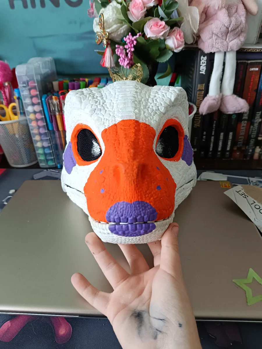 So I bought a dino mask( actually bought 2 but the other is for my brother) and I wanted to make it look like lolbit. And honestly I am really proud of how it turned out cuz the only thing left to do are the ears fluff and nose