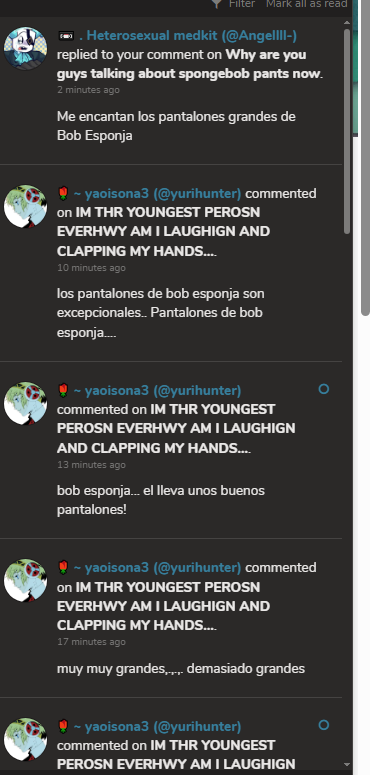 MY NOTIFICATIONS ARE FULL OF A LANGUAGE I CANT UNDERSTAND TALKING ABOUT SPONGEBOB AND PANTS