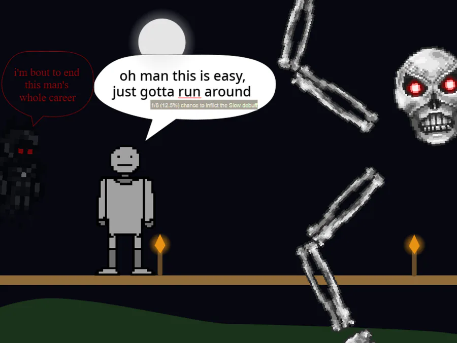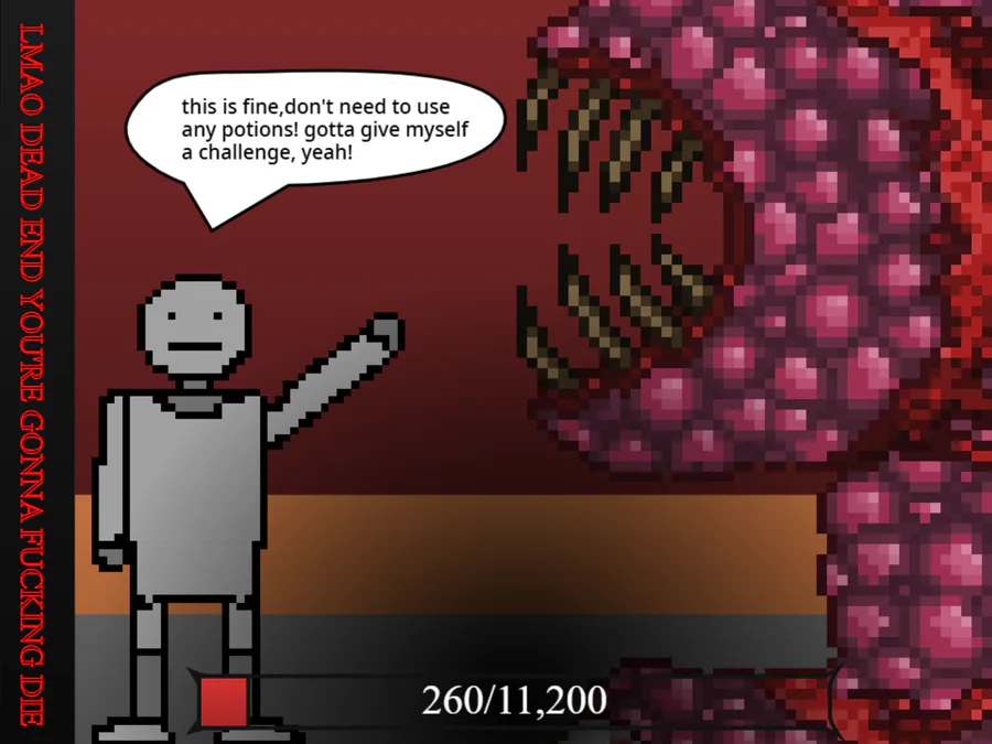 calamity fables: only three bosses, but they're ridiculously peak and less content means my 4 gb ram can actually run it and not implode