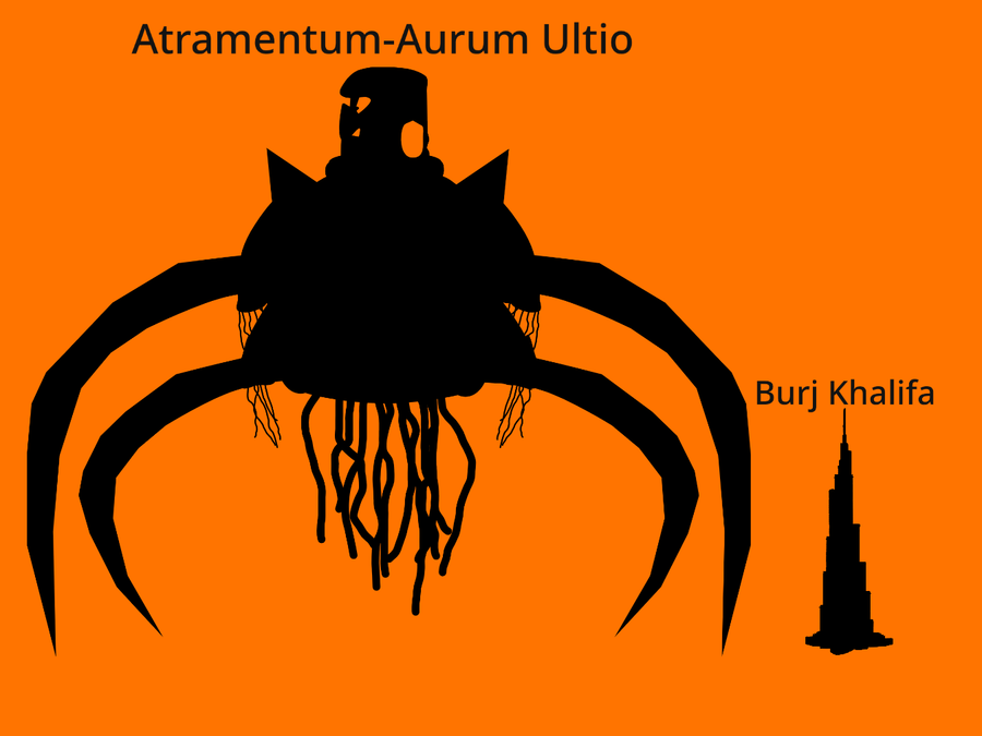 Info: Atramentum-Aurum Ultio, the Altivolus Consumptor, is a colossal entity standing more than over 900+ meters tall—towering even over the Burj Khalifa—that possesses a devastating array of physical, elemental, and digital abilities. Born from the tragic explosion at Hero Pizza Palace and empowered by Golden Toy Lock Sonic, this "Ink-Gold Vengeance" wields four massive spider legs for high-speed mobility and a cluster of mouth tentacles for massive-scale consumption. His primary weapon is Gold-Ink, a versatile substance that can flow like liquid to flood entire cities or instantly harden into an indestructible, gilded armor. This power is further enhanced by a glitch-based phase-shifting ability, allowing him to teleport or pass through solid matter before re-solidifying his ink inside targets for total destruction. Communicating through a booming, glitched static that resonates for miles, he functions as a living natural disaster, combining the raw heat of his explosive origin with the reality-warping energy of the Golden Lock.