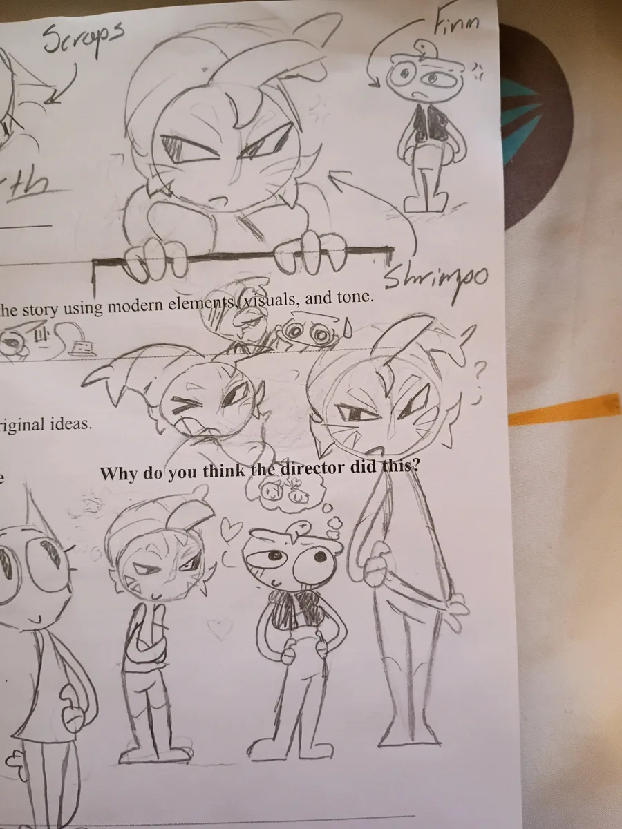 Shrimpo and Finn doodles on my English work