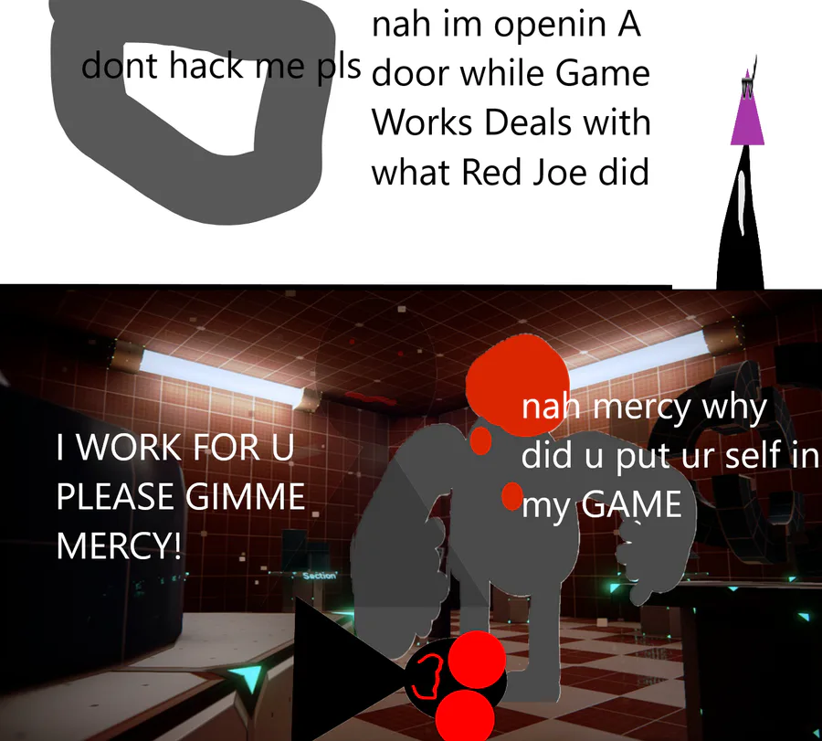 When Game Works was testin the game he found out Red Joe putted himself in the game so Game Works Deleted red joe from the game & beated up red joe also dinotrainer4 hacked the game to open A wall (pls dont ever hack).credits to game w..