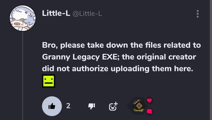 Sadly due to the Owner of the Granny Legacy EXE Atmosphere. They didn't authorize me (someone who uploaded it onto my gamejolt page) So I had to remove it. Even tho I gave credits. But it's fine.
