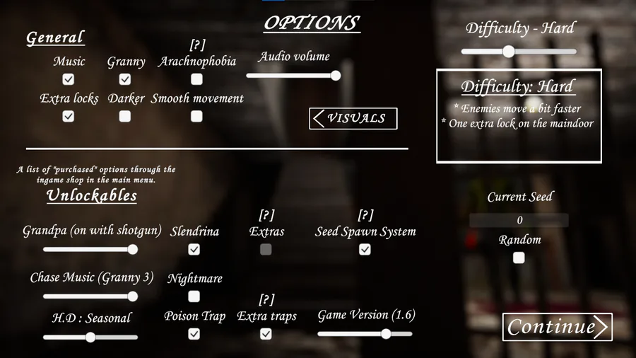 Added a small menu to the pause screen showing the current run’s settings (difficulty, grandpa enabled, extra traps, etc.) – press V.