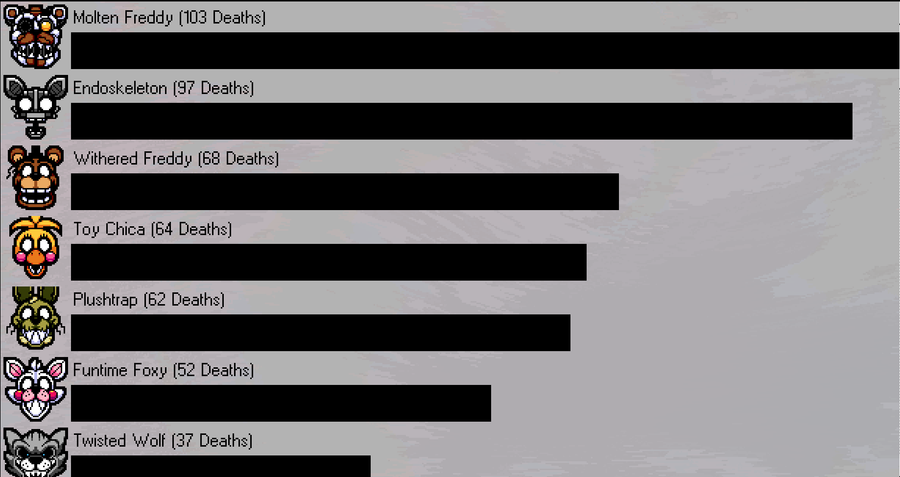 has been hard at work playtesting the game's custom night to see if 40/20 is possible! These are his death stats as of right now.