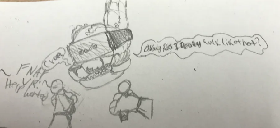 Have a doodle of Scraptrap/William Afton playing Fnaf VR: Help Wanted #fanart Ps. Sorry for my horrible hand writing (1. Crap. 2. Okay, do I really walk like that?)