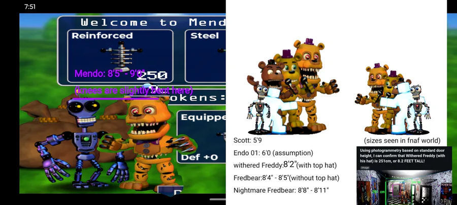 I almost forgot I did this, but I calculated Mendos Height in Fnaf world. the stuff in the white blank space was done beforehand to see how tall Nightmare Fredbear was. the calculated height of withered freddy was not made by me