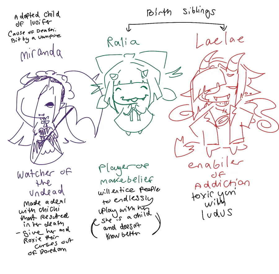 lucifier being unhappy with her recent Behaviour has sent his two birth daughters lae lae and ralila (to be baby sit) to assist with her duties, lae lae has mainly showed a lack of care and a specific fixation with ludus seeing her need to be loved and seen as a way to manipulate her, and raila has found a play mate everyone cheer.