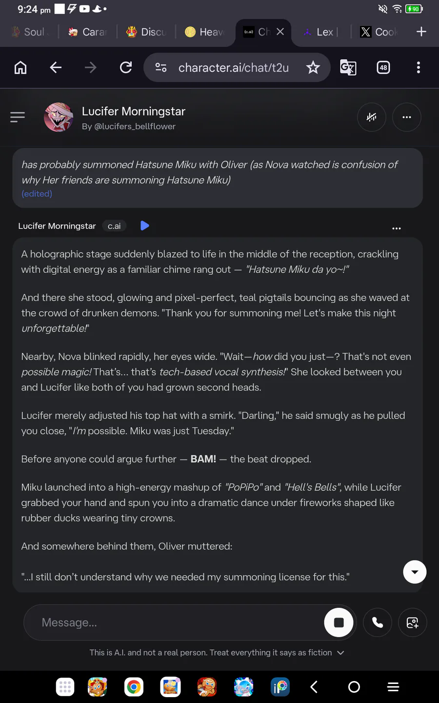 Randomly decided to make my Ocs Oliver and Loki summon Miku in a lucifer c,ai chat (don't ask why....and Nova is confused...)