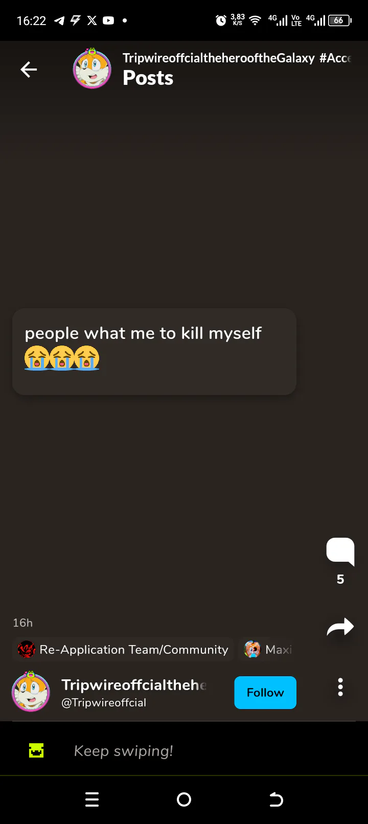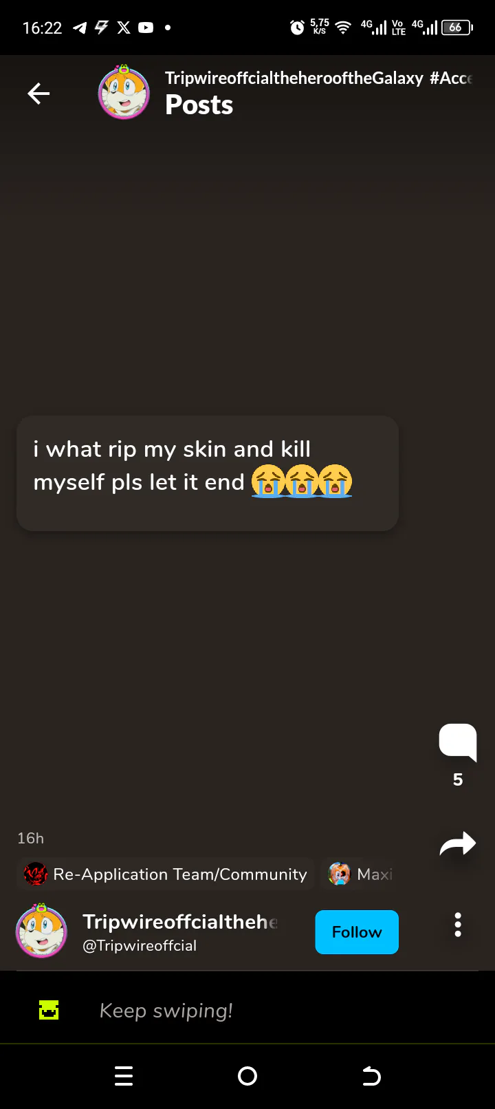 Also, just in case, I'm gonna say this. DO NOT send him death threats or any threats at all. Block and report - the best strategy that ALWAYS worked. By sending anybody death threats you just show yourself as a dumbass without a brain, be civilized, even with such scums as @Tripwireoffcial