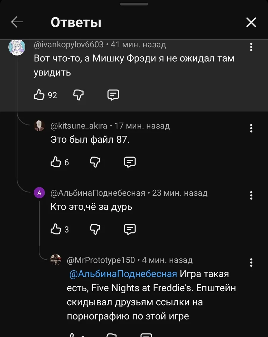 Всмысле Эпштейн фнафером оказался? Знаете, одно время (да и сейчас тоже) ходил юмор, что чуть ли не все контент мейкеры по фнафу пдф файлы. Походу скоро можно будет заявить обратное утверждение, что почти все пдф файлы фнаферы