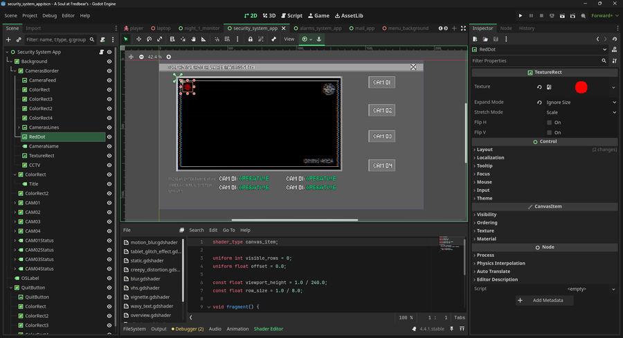 Basically in the second image there is a scene with a shader (CCTV) and in the first there's the scene imported onto another scene with another shader (Screen) with a BackBuffer behind it, but, incredibly it doesn't works and now idk how to solve it and it's so frustating :)