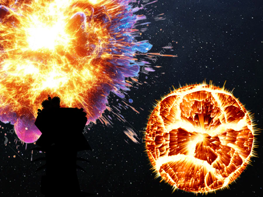 2nd Picture Lore: When he turned into his 2nd form, his 6 spikes were still on his back. He grabbed everything salvaged and every non-perishable foods and drinks and put it in his cross body bag which has created an infinite storage due to his powers, no matter how big or small it is. When he flew out of earth, the planet became a molten wasteland and the sun had become a red giant due to the monolith greatly reducing the solar system's years to live. When he escaped the planet, the sun, meteors, and every planet exploded.He was flung away from his home star system and home planet. When he woke up, he was still in one piece and everything was fine, but not the universe. The Monolith had consumed everything, leaving this universe dead. He may have escaped his fate, but not escaped seeing the universe end...