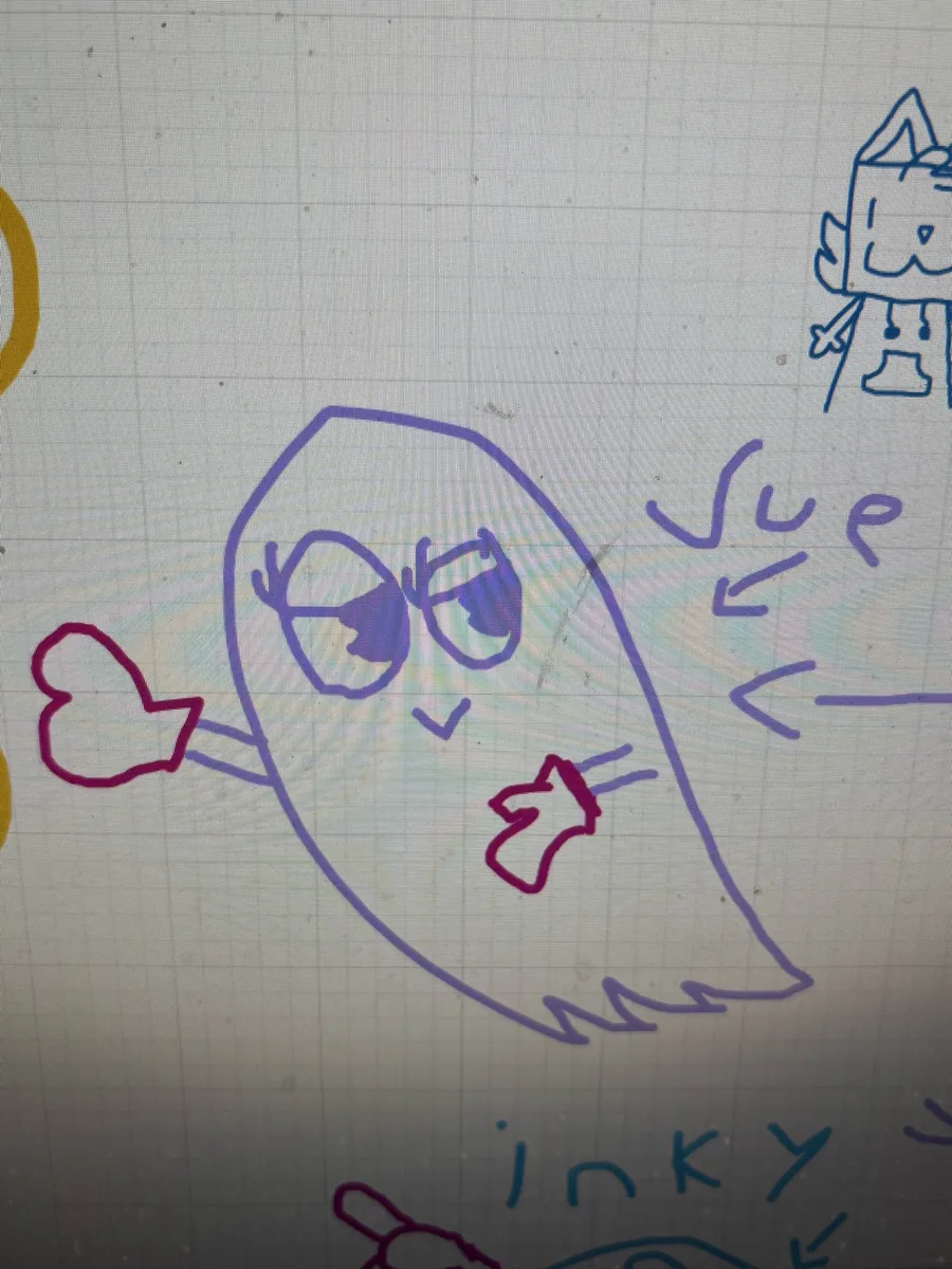 drew the wedge design of Pac-Man but, he will tell me but for now enjoy my ghost gang, plus Pac-Man and Blinky having beef, also note Blinky flipped the bird at him