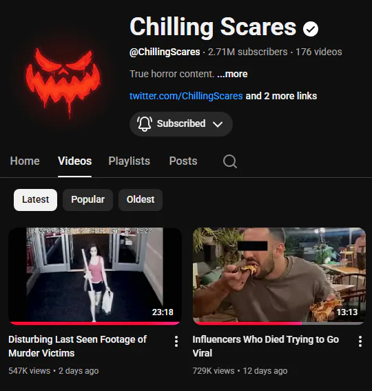 Another channel i highly recommend you to check out is Chilling Scares, he's a great youtuber that makes disturbing, but extremely exciting videos about incidents, caves, abandoned locations etc. If you're a horror fan, please check him out!