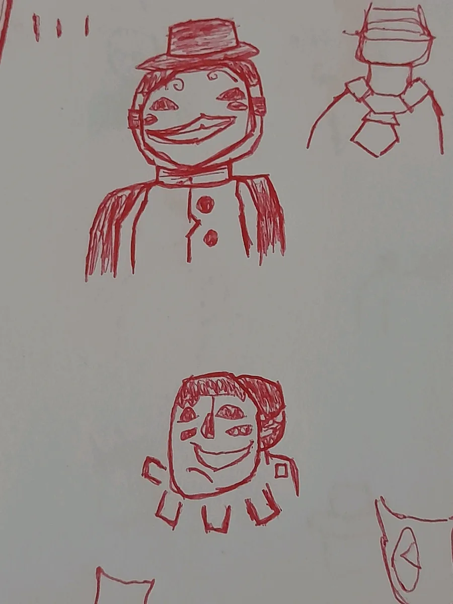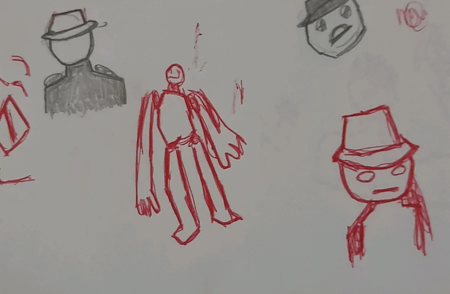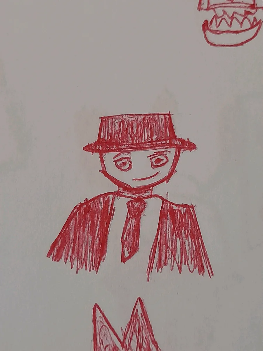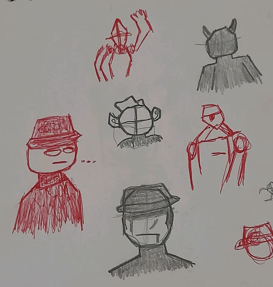 I Use pen to draw, one at middle is normal character but it's so big, one at right is just guy with hat but I didn't draw him having arms and one at up-left is guy but there's no much known about him