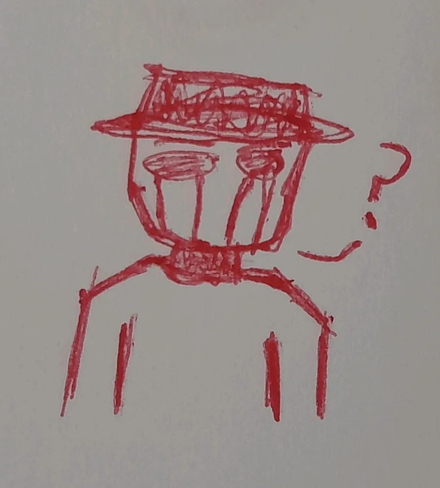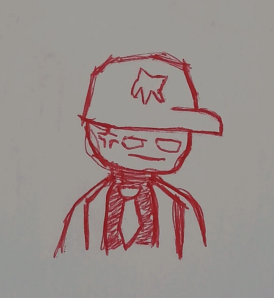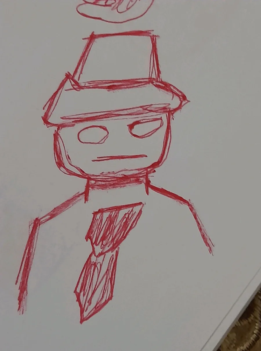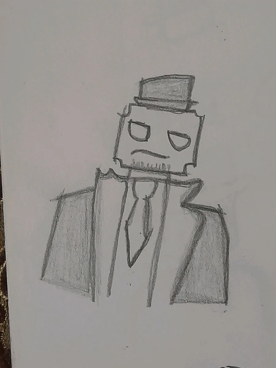 I Use pen to draw, one at middle is normal character but it's so big, one at right is just guy with hat but I didn't draw him having arms and one at up-left is guy but there's no much known about him