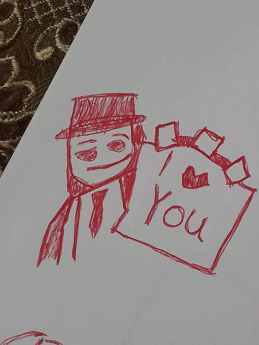 I draw a guy with paper "I love you" I draw him and post on gamejolt because I was happy that anyone who supporting me or were become new friend so this draw of guy with paper is me yes, it's me but I don't draw myself in real life anymore