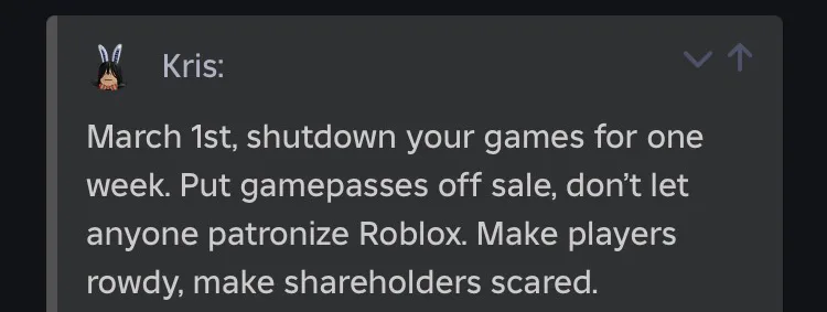 there’s a roblox blackout being planned on march 1st to protest roblox corpo and david’s bullcrap, i recommend praticipating in this