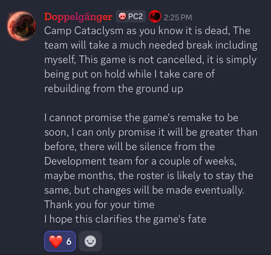 Clarification from Scrap. The game will be rebuilt from the ground up and the devs will be a taking a much needed break