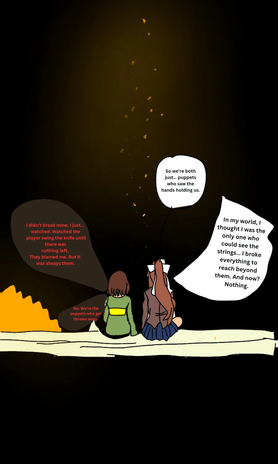 I've been thinking of the concept of Monika and Chara being trapped in a mysterious void and they to work together to escape, worst part though? Can't make right now because I have SO many games I have being worked on sooo for now just concept not real.