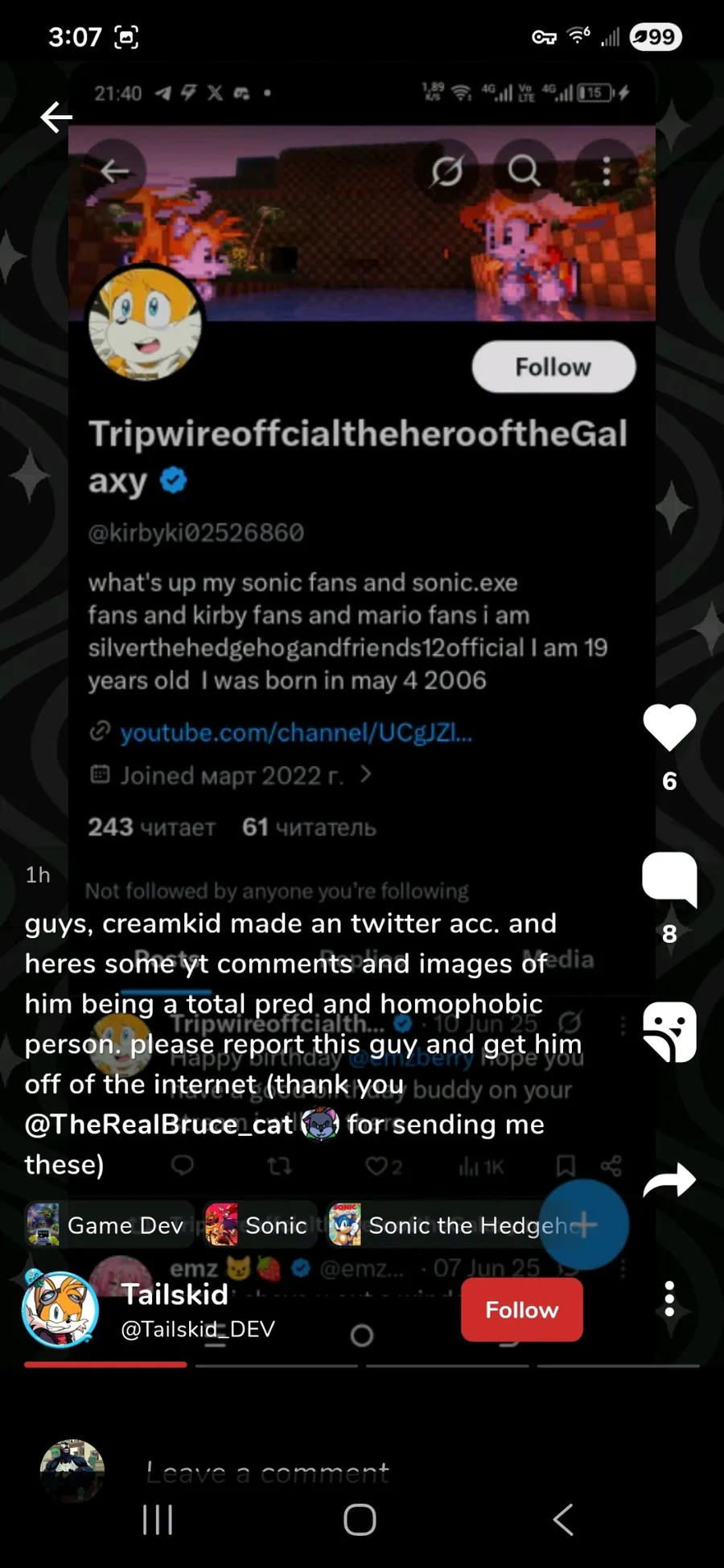 Hey wanted to spread awareness about this person they are a pdf and homophobic please report them credits to @Tailskid_DEV